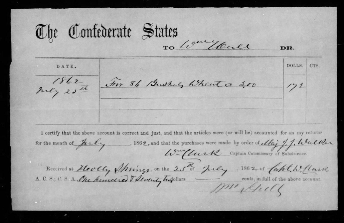 Family historian John W. Herndon claims Civil War service for both William and Dabney; however, while William is found to have enlisted in the 1st Mississippi (Co. A) as a corporal, I have found no service record for brother Dabney. And even with Williams enlistment, he spent at least the first two years of the war, likely much longer, growing corn and wheat to sell, it would seem, to the Confederate Army. He in fact sold hundreds of bushels of grain to the army while brother Dabney sold only a small fraction of that.